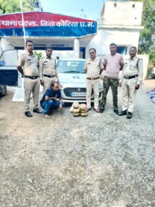 पुलिस अधीक्षक कोरिया श्री त्रिलोक बंसल, अतिरिक्त पुलिस अधीक्षक श्रीमती मोनिका ठाकुर एवं पुलिस अनुविभागीय अधिकारी बैकुण्ठपुर श्रीमति कविता ठाकुर के दिशा निर्देश पर समर्थ अभियान के तहत जिला क्षेत्र में अवैध मादक पदार्थ गांजा, कबाड़, आबकारी अधिनियम एवं जुआ सट्टा के कारोबार करने वालों पर अंकुश लगाने के निर्देश एवं थाना प्रभारी पटना के मार्ग दर्शन पर तथा विधान सभा निर्वाचन की घोषणा एवं आदर्श आचार संहिता प्रभावशील होने उपरांत कोरिया जिला के सीमा क्षेत्रों में नाकाबंदी लगाया जाकर संदिग्ध व्यक्तियों / वाहनों / अवैध वस्तुओं की सघन चेकिंग किया जा रहा है। SST टीम के चेकिंग के दौरान लगे नाकाबंदी डुमरिया में दिनाँक 17.10.2023 को एक सफेद रंग का स्वीफ्ट क्रमांक OD23H6187 को चेक करने पर अवैध रूप से स्वापक औषधि तथा मनःप्रभावी पदार्थ गांजा एक प्लास्टिक की बोरी में 06 पैकेट सेलो टेप से लपेटा हुआ, करीबन 6.230 किलो ग्राम मादक पदार्थ गांजा कीमती 60,000/ रूपये का मिला। घटना में प्रयुक्त एक सफेद रंग का स्वीफ्ट कार कीमती- 3,00,000/ रूपये तथा दो मोबाइल फोन कीमती 22,000/रुपये, कुल कीमती 3,82,000/रुपये को जप्त कर आरोपी को गिरफ्तार कर दिनाँक 18.10.2023 को रिमाण्ड पर भेजा गया है। उक्त कार्यवाही में स.उ.नि. शैलेन्द्र त्रिपाठी, आर. प्रदीप साहू, आर. संदीप साय, एवं NCO 71 सोमारू सारथी की महत्वपूर्ण भूमिका रही।